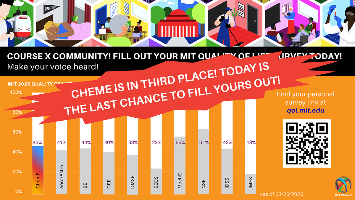 Course X has entered a friendly competition to have the highest response rate in the School of Engineering for the 2026 survey. Here you will find the latest information and standings by department. More info is at https://qol.mit.edu/.